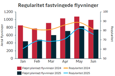 Regulariteten for den fastvingede flyflåde, Dash-8, faldt til 72,0 % (2024: 83,9 %), og punktligheden til 46,6 % (2024: 71,1 %).